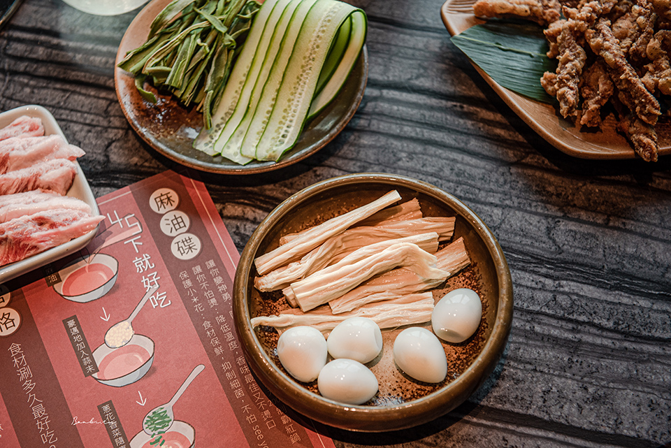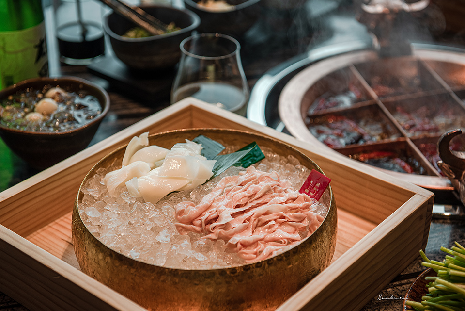 配料有招牌五秒牛舌、爽脆牛肚、生鮮黃喉、脆彈鴨腸、伊比利豬肋條、泡椒嫩牛肉、原味嫩牛肉、水蓮、蓮藕、馬鈴薯片、小黃瓜片、貢菜、生鮮豆皮、鵪鶉蛋。