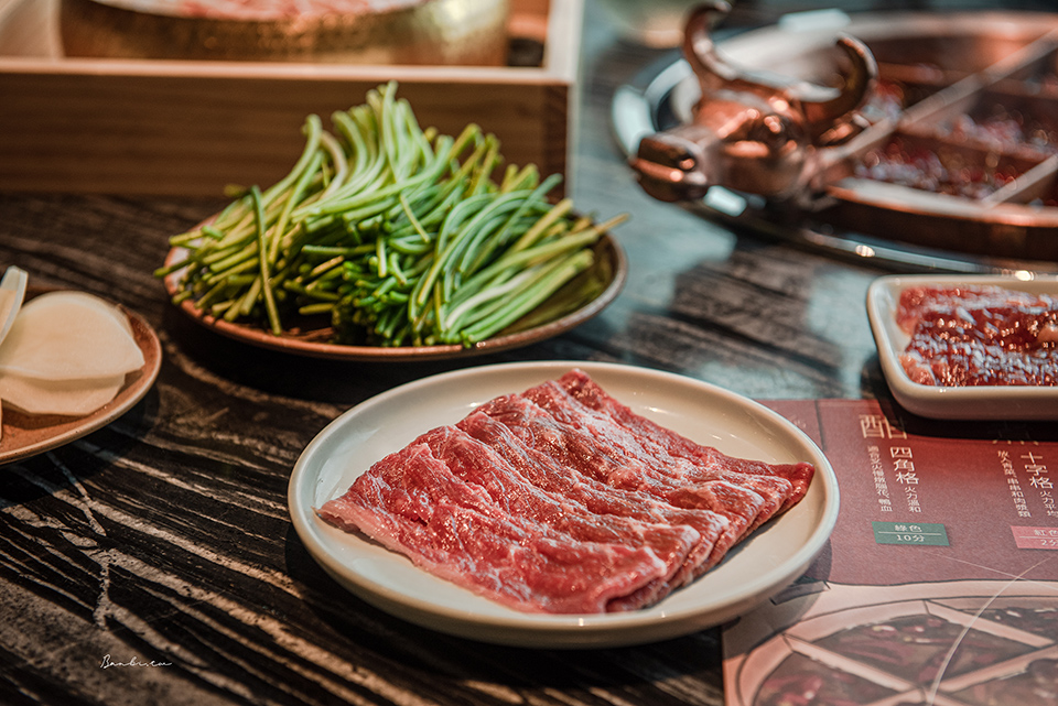 將此澳洲和牛肉入鍋中「中間格」涮肉,品嚐肉的甜美與腿肉軟中帶有彈性的肉質。油花分布均勻卻不顯過於油膩,對於和牛牛油重慶麻辣鍋這類高油香的美食來說,腿肉會相對於其他肉片來得爽口。
