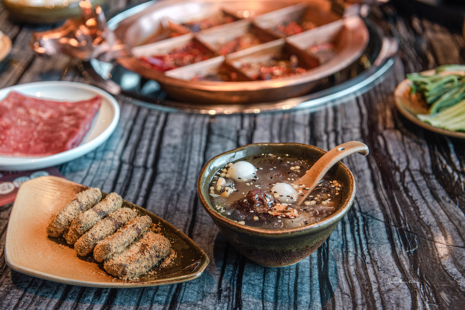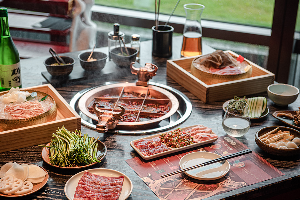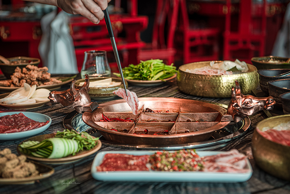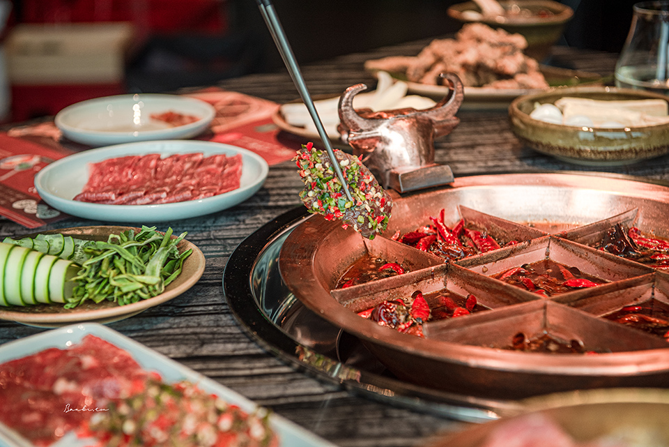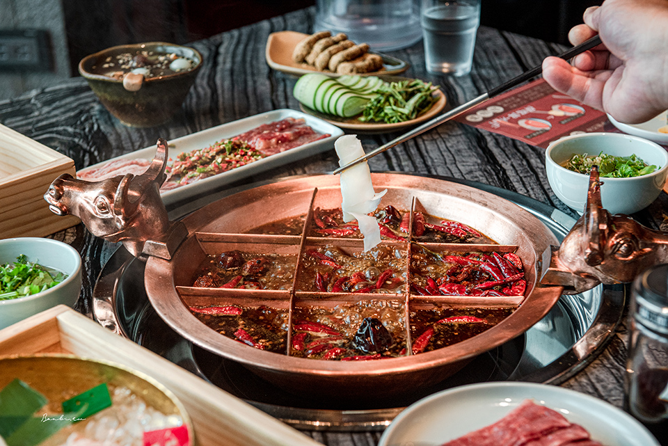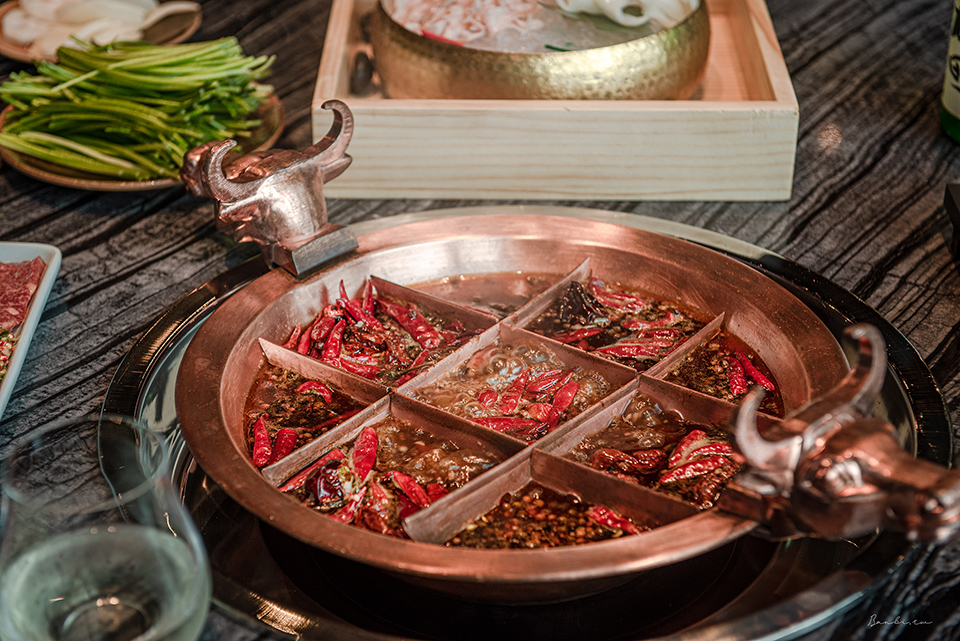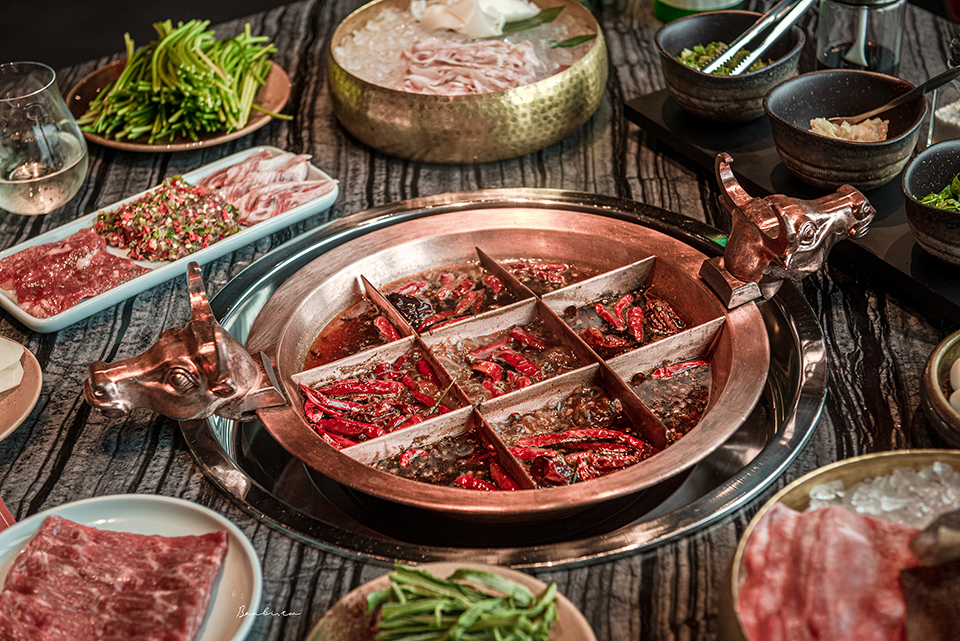 中間格子因為火力最大用於「燙」,涮牛肉、毛肚、精選牛肉等最好;十字格子作為「煮」,比如青菜、串串和牛。鍋子對角的四角格最適合「酣」,需要以細火久煮慢燉的鴨血、腦花或是海帶根、貢菜。