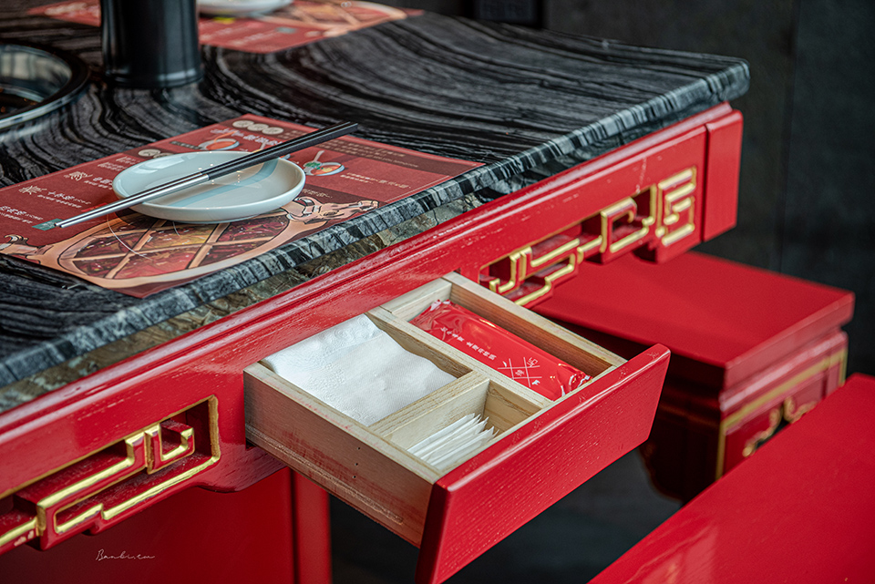 我們所坐的方桌間設計了夾層抽屜,當抽屜拉開有濕紙巾、衛生紙和牙線棒。對於吃辣便很容易爆汗的我來說,當我因吃麻辣九宮格吃得滿頭大汗時,就能快速的擦汗,覺得非常方便。
