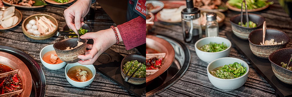 由於重慶麻辣鍋的味道很重,會搭配什麼沾醬料便使我感到很好奇。而後只見服務人員將麻油、雞湯粉、蒜末、蔥花和香菜(若有不吃的食材可先告知)調配成特製的「麻油碟」,可減緩辛辣感以及降低起鍋食材的溫度。另可隨個人喜好加上鎮江醋調味,芝麻油香中帶鎮江醋溫和的酸味,也可以減緩麻辣感。