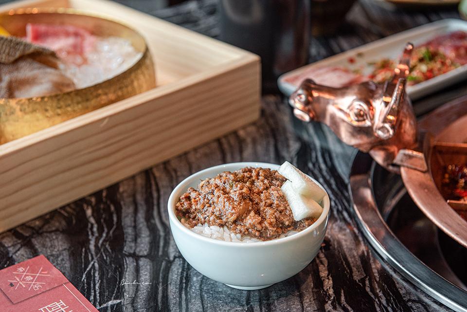 由於還是習慣吃點飯食,另外加點了「和牛牛油肉燥飯」($65元)。煮的晶瑩剔透、晶亮的越光米飯上,淋上用和牛牛油烹煮的肉燥飯,肉燥末燉煮的非常細緻,介於肉燥和肉醬之間,有溫順的牛油香和油蔥香氣。一旁搭配了醃漬的漬蘿蔔,酸甜清脆,能增添爽口滋味。