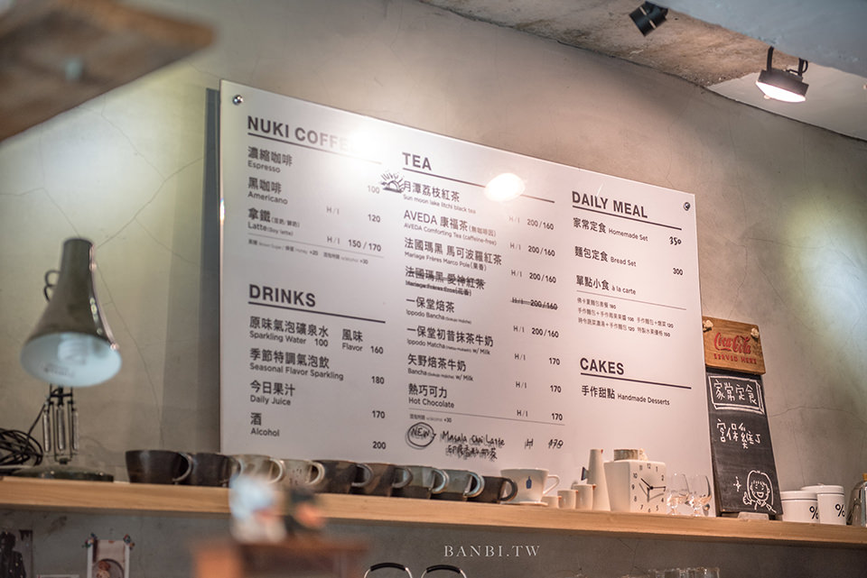 NUKI Coffee的菜單可在櫃檯前拿取,或者在櫃檯後方也寫有固定菜單。由於週六、日一早就有營業,想來此吃早餐也可點選麵包類,而當天的家常定食則是宮保雞丁,下方還畫了可愛的店主豎著大拇指推薦的樣子。