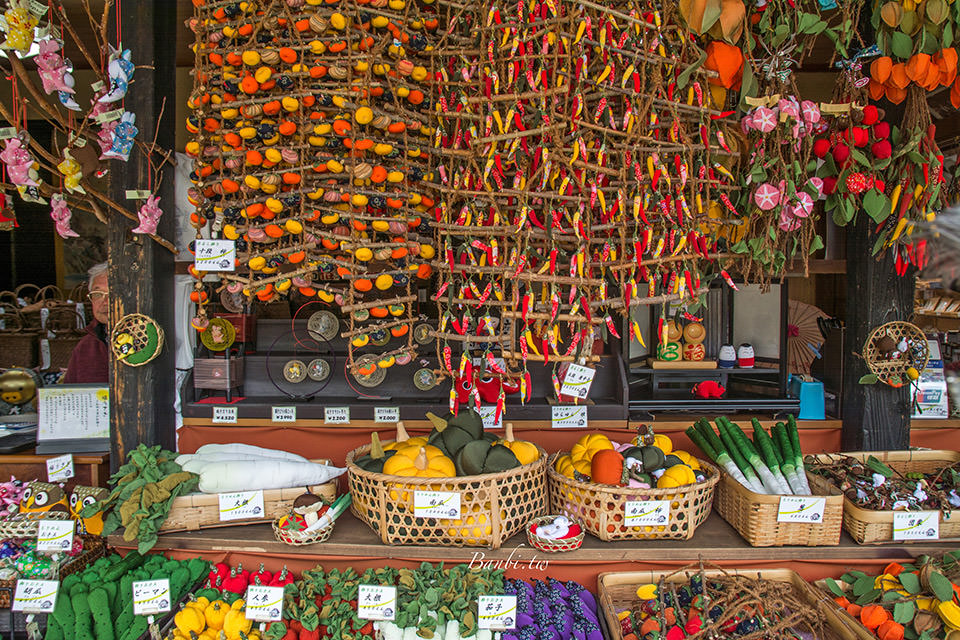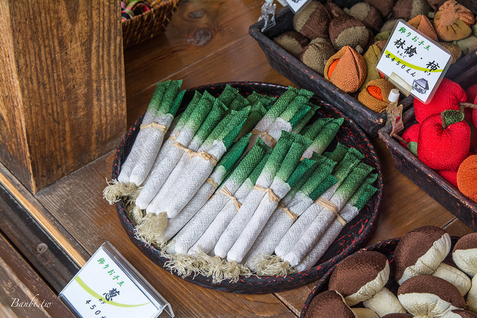 突然看到一間擠滿日本阿公阿嬤的店,也太有趣了竟然是布做的蔬菜,小黃瓜、辣椒、茄子、南瓜、甜椒、蘿蔔、蔥、番茄、香菇、柿子、栗子,還有一些植物與動物樣子。