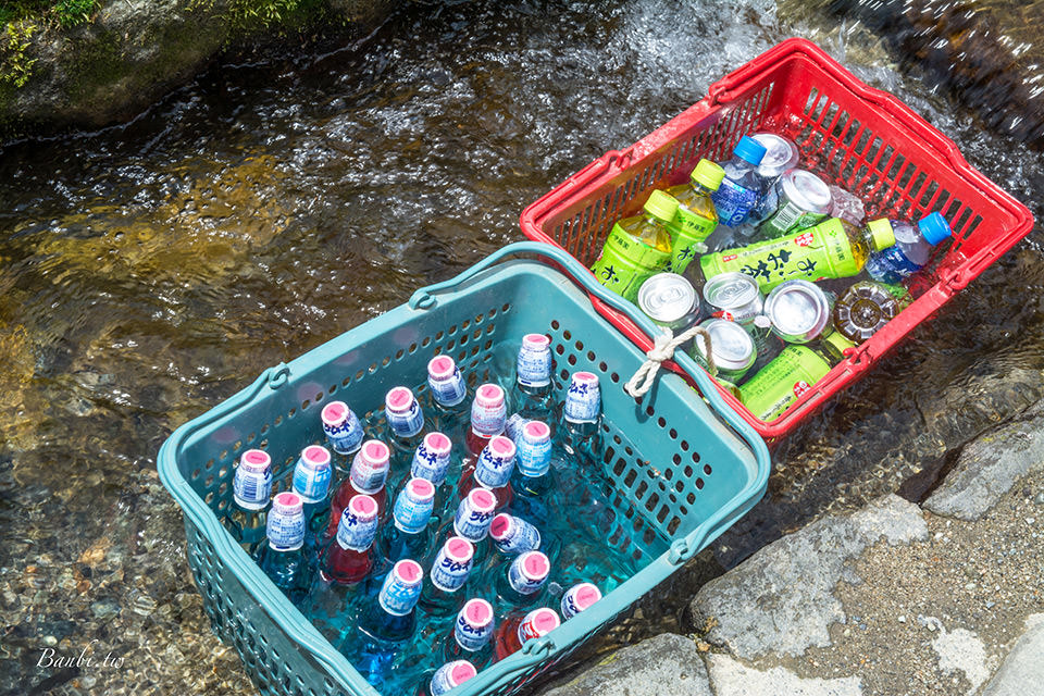 泡在小溪內的彈珠汽水與日本茶、汽水,不知道為什麼,總是感覺好像比較好喝。(笑)