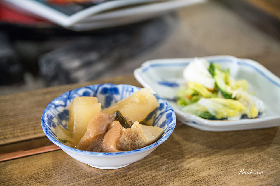招待的小菜有漬菜還有豬肉蘿蔔煮,蘿蔔煮的很軟綿,漬菜很清脆。
