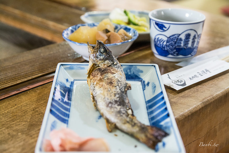 鹽燒岩魚,也可以選擇香魚,但既然來了日本就吃看看少見的岩魚吧!