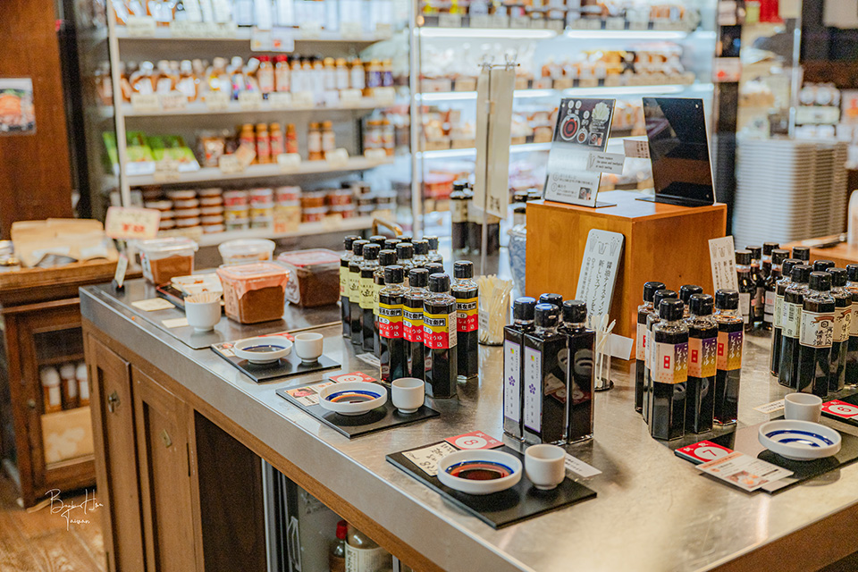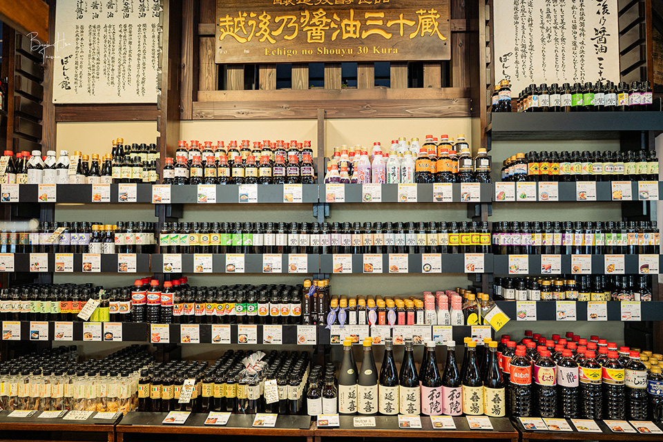 心滿意足後繼續於「PONSHU館 新潟車站店」購物,這裡有少量的仙貝、米果、果汁、甘酒、笹糰子。因新潟的發酵食品文化盛行,有一區展示了越後乃醬油三十藏,不僅有30家醬油廠的商品,可試吃多款醬油與味噌。