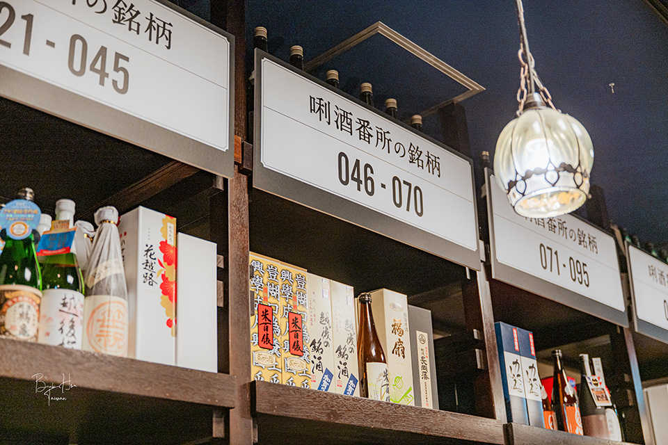 精選新潟111間酒藏的日本酒,每一個販賣機上有該清酒的酒標、酒藏資訊、清酒名稱類型、代幣枚數,下方可見辛口度、濃醇度、酒香度、酒精濃度,左邊手寫字說明了該清酒風味描述。