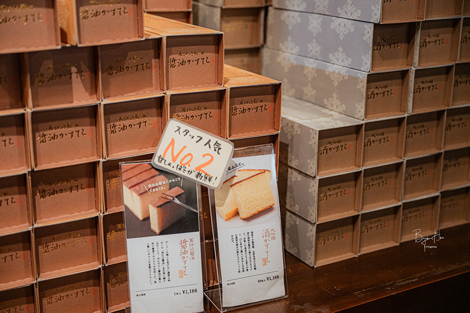醬油長崎蛋糕、大吟釀長崎蛋糕,我買了大吟釀長崎蛋糕回台灣(保存期限約1個多月,請以包裝上標示日期為主),覺得放置到後來似乎有越陳越香的感覺,蛋糕充滿了酒粕香甜味,雖口感略乾些,但可嚐鮮看看。