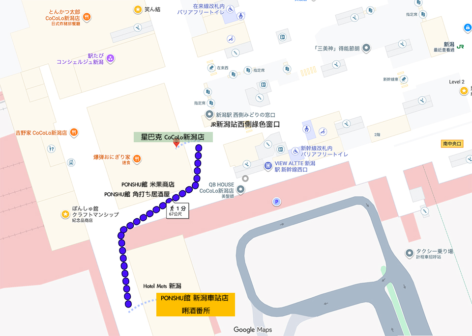 我標上「PONSHU館 新潟車站店 唎酒番所」的路線跟前往方式,Google Map圖片下方以銘黃色方格標示區塊即是。