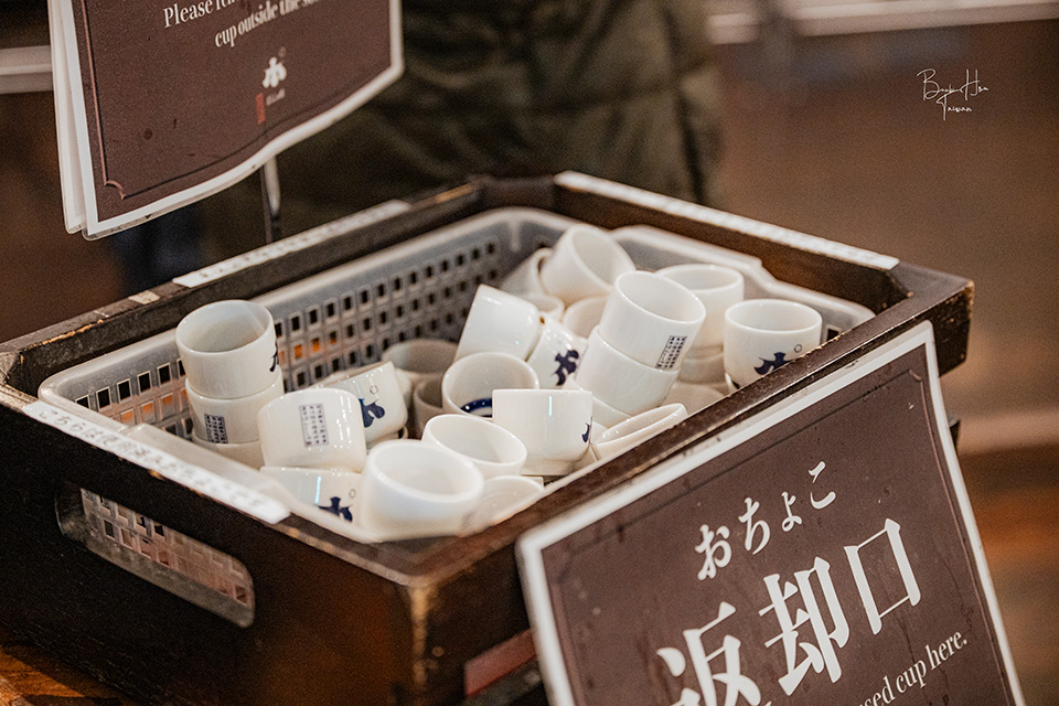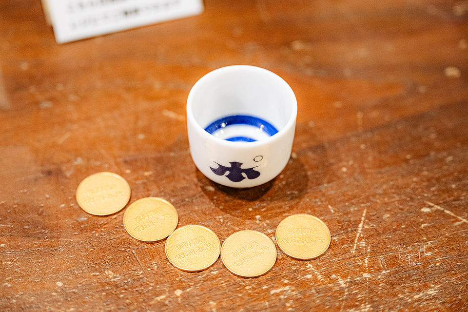 先走到館內最裡面的位置,便是唎酒番所清酒自動販賣機接待處,早上09:30開始營業,有次假日來時發現一早已排滿許多酒客。以500日幣可兌換5枚硬幣,櫃檯人員會另外提供一個清酒杯(用完後放回到集中籃),就能開始找尋想喝的清酒了!(兌換次數不限,當時見到有客人一次兌換1500日幣)