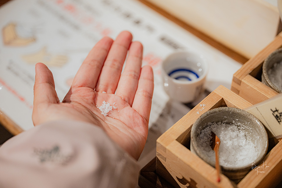 「PONSHU館 新潟車站店 唎酒番所」角落放置許多種鹽巴,這是源於江戶時代流傳的日本酒飲用方式,將鹽巴一小戳放於「枡」一角(枡:四方形木盒),與酒一起享用,據說鹽巴更能帶出清酒五味中的甜味、旨味。因在唎酒番所無「枡」使用,可用小湯匙挖取一點點倒入手中,以手代替「枡」。