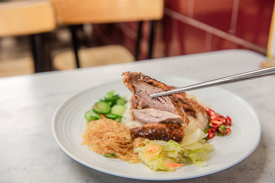 第二次再訪家鴻燒鵝時特地選了10:20一開店時前來,開心的想著這下總算可以吃到燒鵝腿飯時,同樣被告知只剩下1/4鵝肉的部位(因早上10點就開放電話訂餐,不少附近公司的上班族早已搶先預訂了燒鵝腿飯)。礙於和朋友Alina兩人實在吃不下1/4隻量的燒鵝,幸好烤鵝飯還有。