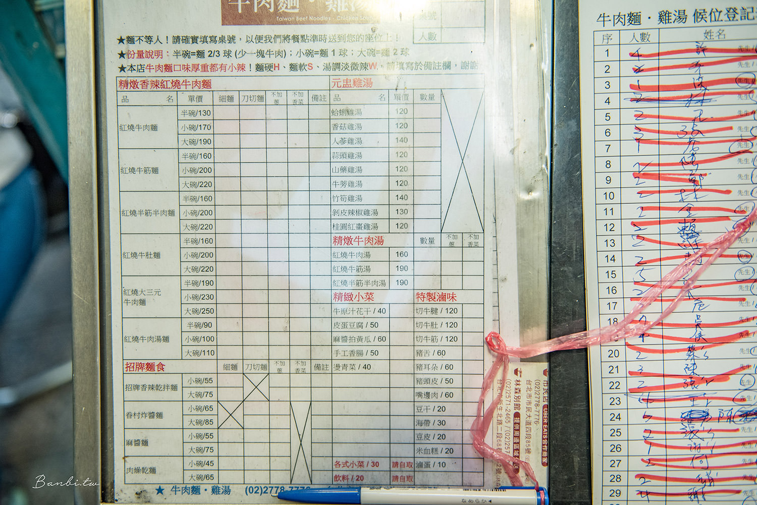 到達「牛肉麵雞湯」後若是須候位,請至店前的登記表上寫上聯絡資訊與用餐人數。