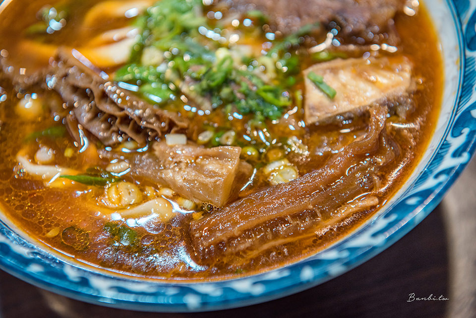 湯麵均為牛肉麵,可選紅燒牛肉麵、紅燒牛筋麵、紅燒半筋半肉麵、紅燒牛肚麵,以及三種皆有的紅燒大三元牛肉麵,不吃牛肉僅想喝湯頭者還有紅燒牛肉湯麵。牛肉麵可依照麵的份量選擇半碗(麵2/3球、少一塊牛肉)、小碗(麵1球)、大碗(麵兩球),麵條可選擇細麵或刀切麵,麵條軟硬度、湯頭是否要調整淡及微辣都能客製化