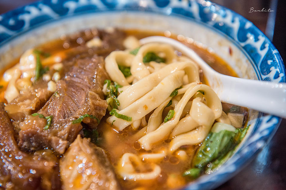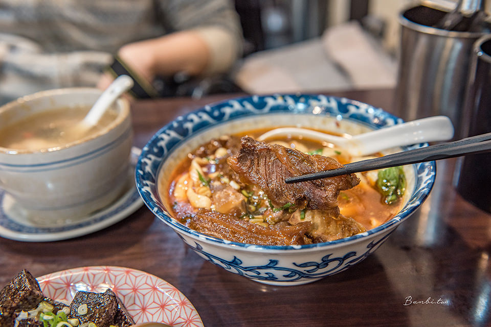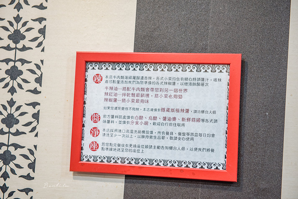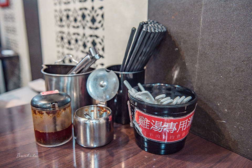 店裡牛肉麵湯頭為濃郁帶小辣感,若喜歡更重口味,可以搭配牛辣油或者隱藏版及辣醬,桌上也有搭配乾麵小菜的辣紅油、辣椒醬。