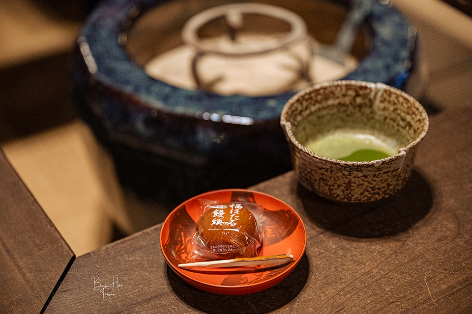 高志之宿高島屋的迎賓點心,溫泉饅頭和涮抹茶。