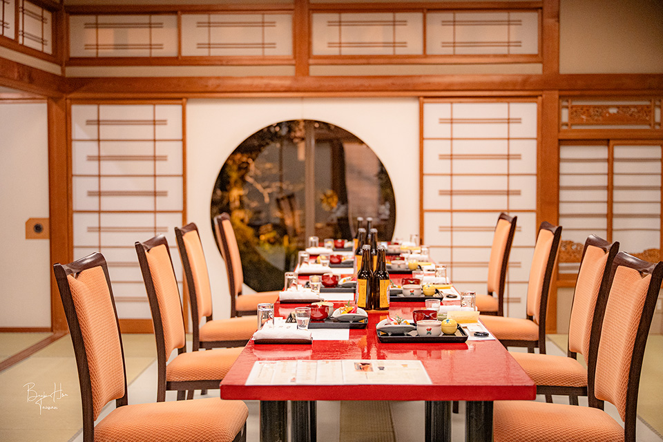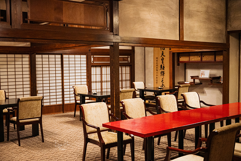 大廳旁的「駐蹕の間」,在1878年(明治11年)時明治天皇巡視北陸地區來到此,當時住在這個房間,所以他們將房間的結構都保留下來,現今更改為餐廳使用。