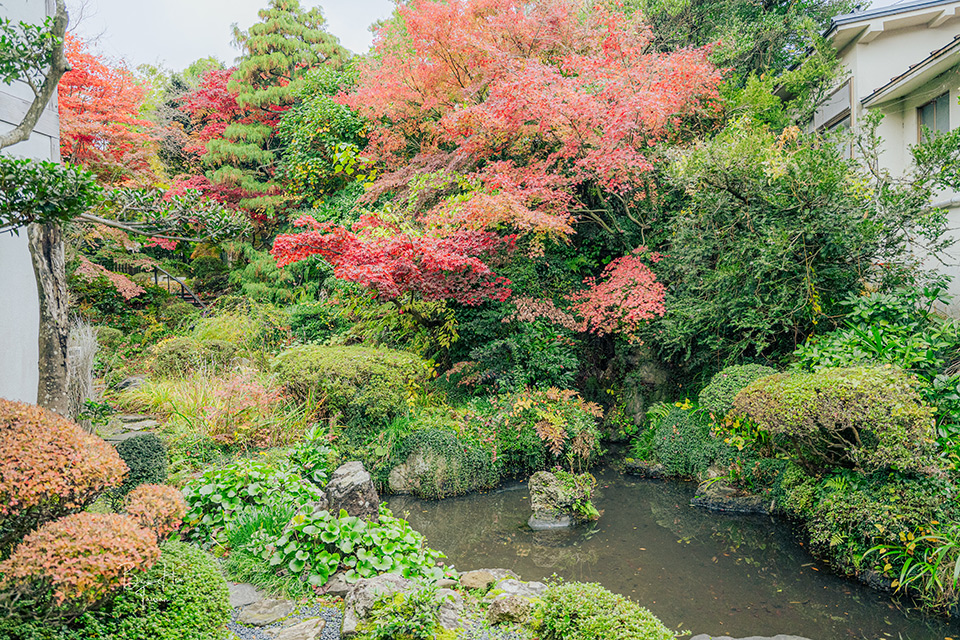 大廳望出去的庭園,初春季節時,野生貓頭鷹會飛來棲息、築巢,由於貓頭鷹被視為帶來幸福的象徵,因此庭園被命名為「福が来る庭園」。