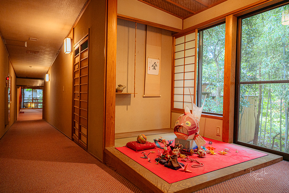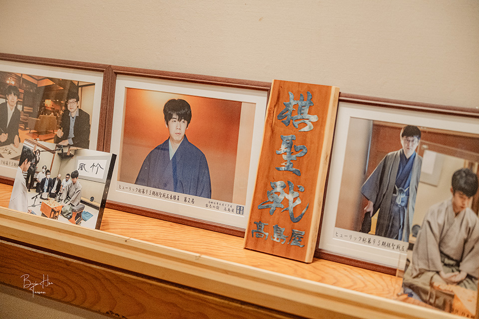 女將帶領我們通往長廊,見到牆面擺放了日本將棋ヒューリック杯的照片、海報,他開心地說這是2024年6月17日時「ヒューリック杯第95期棋聖戦」第二局在旅館內進行,由藤井聰太棋聖與山崎隆之八段對弈,另外將棋手羽生善治也曾到訪過他們旅館。