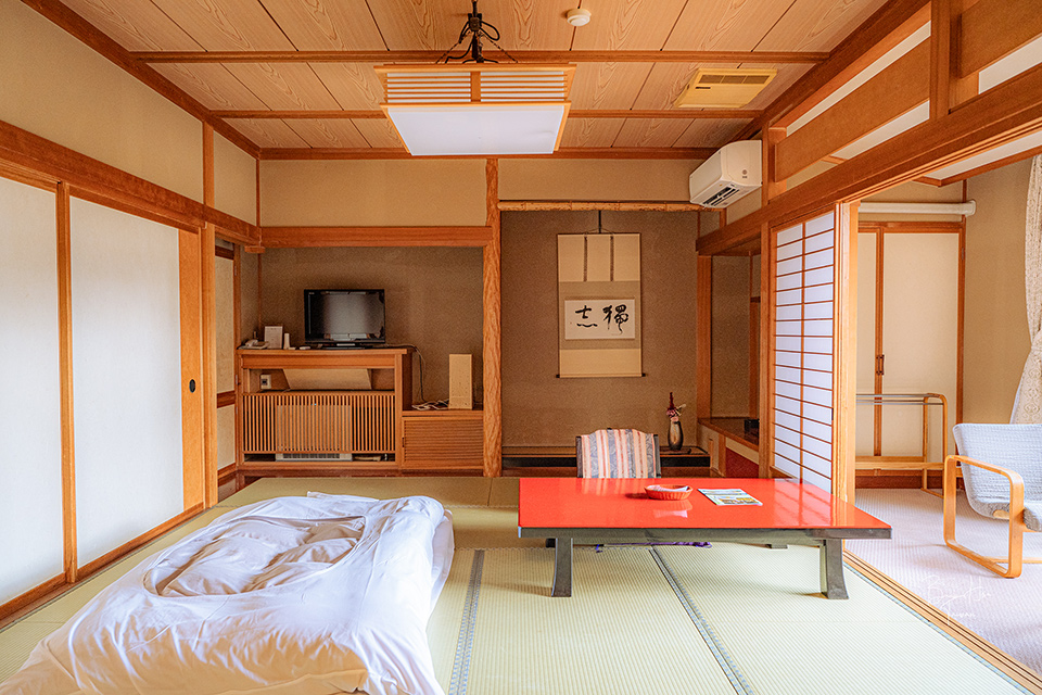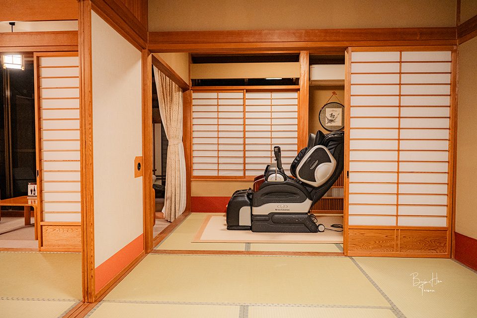 我住宿的房間是一樓的「橘-たちばな-」,作為以往圍棋十段戰與將棋棋聖戰時,選手比賽休息的房間使用。以兩人房來說空間非常寬敞,共16張榻榻米大,另加上3張榻榻米大小的空間放置了按摩椅。
