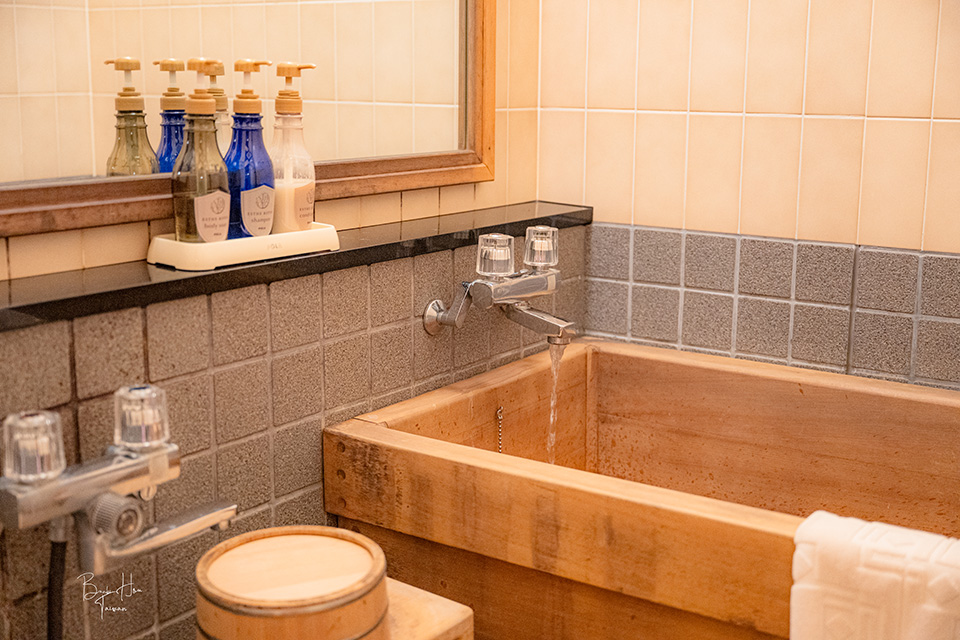 房間附設的浴室無提供溫泉(僅有「常磐-ときわ-」、「紫苑-しおん-」、「柊-ひいらぎ-」才有提供溫泉),推薦到大浴場洗澡,因這裡的溫泉為硫磺和鹽(氯化物溫泉)的高滲透壓溫泉,又名為岩室黑湯,帶有些硫磺味道之外,溫泉呈現黑色。雖然以往也曾在青森東北溫泉遇過黑湯,但這裡的岩室黑湯卻是泡完後肌膚會附著淡淡的黑色,記得再次洗澡洗去溫泉物質。