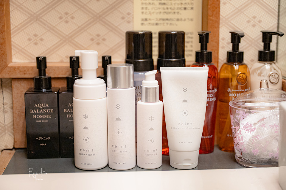 我住宿的這間「橘」房內提供了八海山酒造酒粕製作的保養品,試用後覺得化妝水的保濕效果不錯,泡沫洗面乳也很細緻,於是退房前到賣店買了化妝水與洗面乳回台灣。