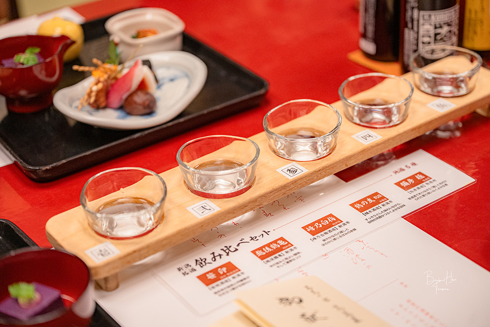 至新潟旅行時好幾餐都伴隨著酒飲,旅館晚餐菜單可另外單點啤酒、日本酒或是3種/5種的新潟日本酒評比,我們喝了笹祝酒造 純米無濾過酒、越後鶴龜 純米酒、峰乃白梅 純米酒、樋木酒造 鶴之友 別撰 本釀造、彌彥酒造 彌彥 極 普通酒。