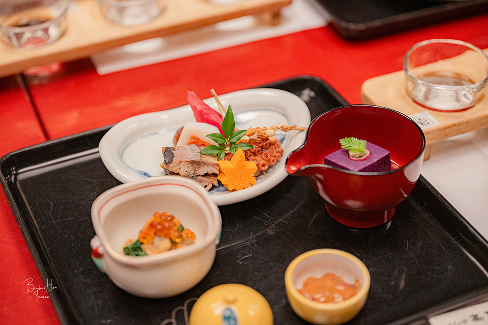 最上方白色那盤「鰊旨煮」:紅葉蘿蔔長崎蛋糕(カステラ)、煙燻鮭魚小川卷、柔煮章魚、栗子澀皮煮、茗荷壽司。