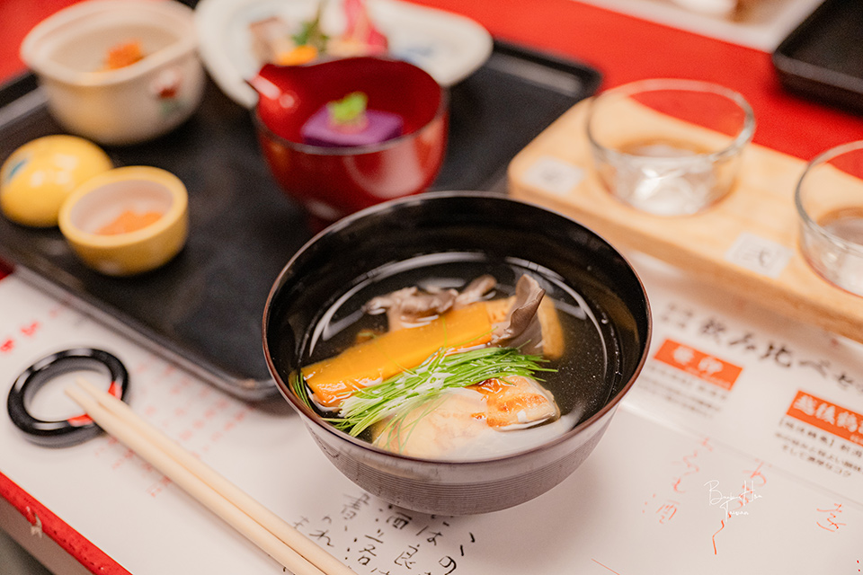 加入蝦子、菇類、胡蘿蔔、芽蔥的清湯,再以柚子提香,我因對蝦子過敏更改為魚。