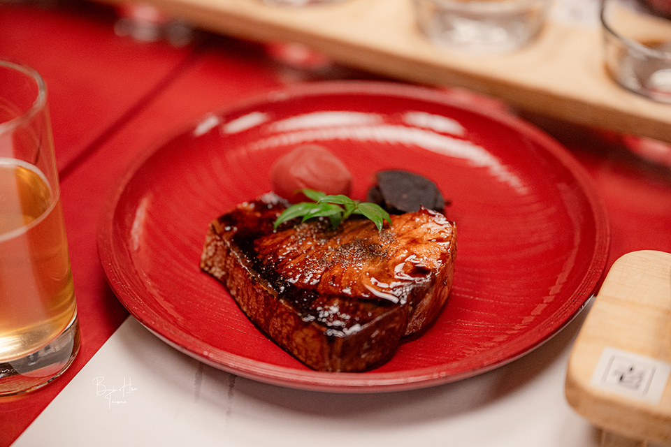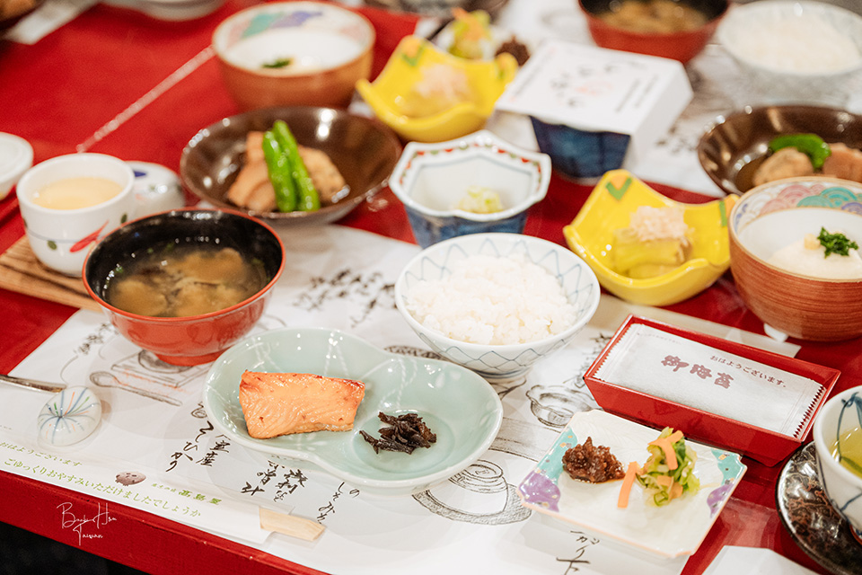 好吃的照燒鰤魚搭配帶甜味的煮梅、漬蘿蔔(這裡用的是三年熟成味噌漬蘿蔔,加入柚子和胡麻一起醃漬,是岩室溫泉區的鄉土料理)。