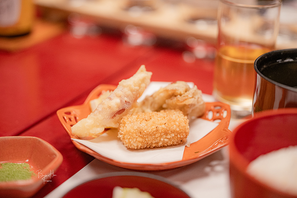 以玄米作為胡麻豆腐的外衣油炸,搭配炸舞菇、炸茗荷還有抹茶鹽。