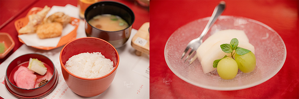 岩室產越光米新米,搭配漬物、味噌湯以及飯後水果(如白飯、漬物、湯需要先上主食,可以先告知旅館人員)。
