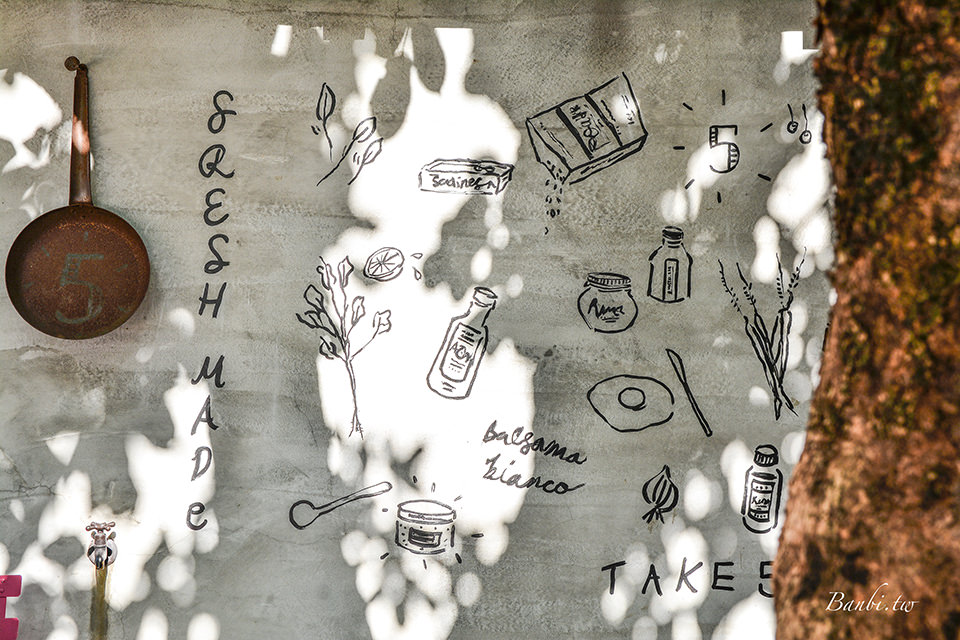 Take Five五方食藏的門前還有一區小庭院,擺放了幾張桌子,由於庭院前有棵大樹,加上這附近街道來往的車子並不多,所以當天氣好的時候也會有客人坐在店外用餐,就像那些歐洲的餐館一樣,坐在戶外開心隨興地用餐。