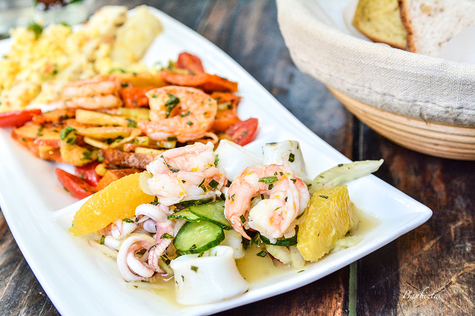 店裡賣的最好的季節冷菜,新鮮的海鮮(蝦子、花枝),拌上香菜、橙汁、檸檬油醋,十分地清爽酸甜,我很喜歡!