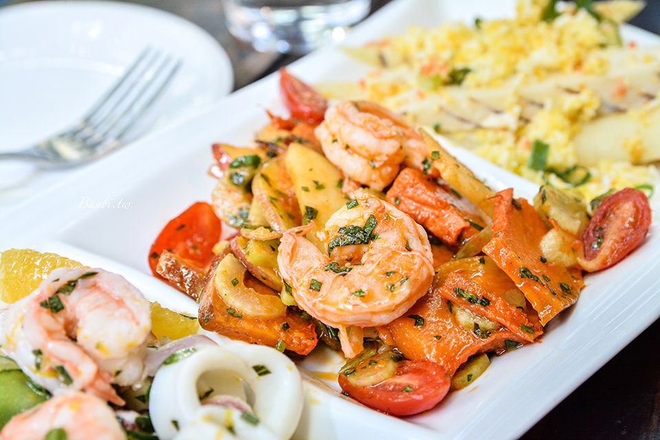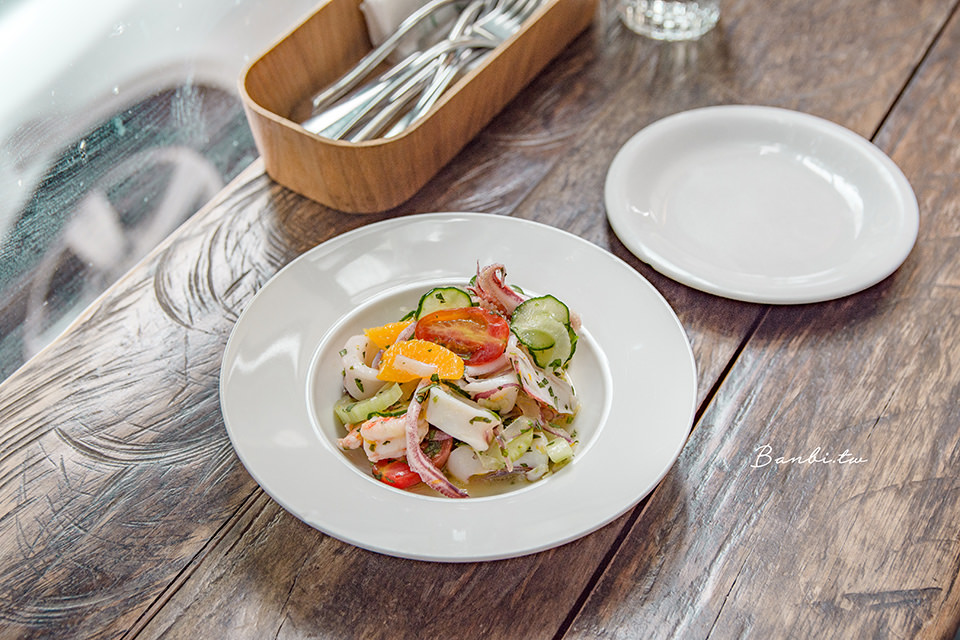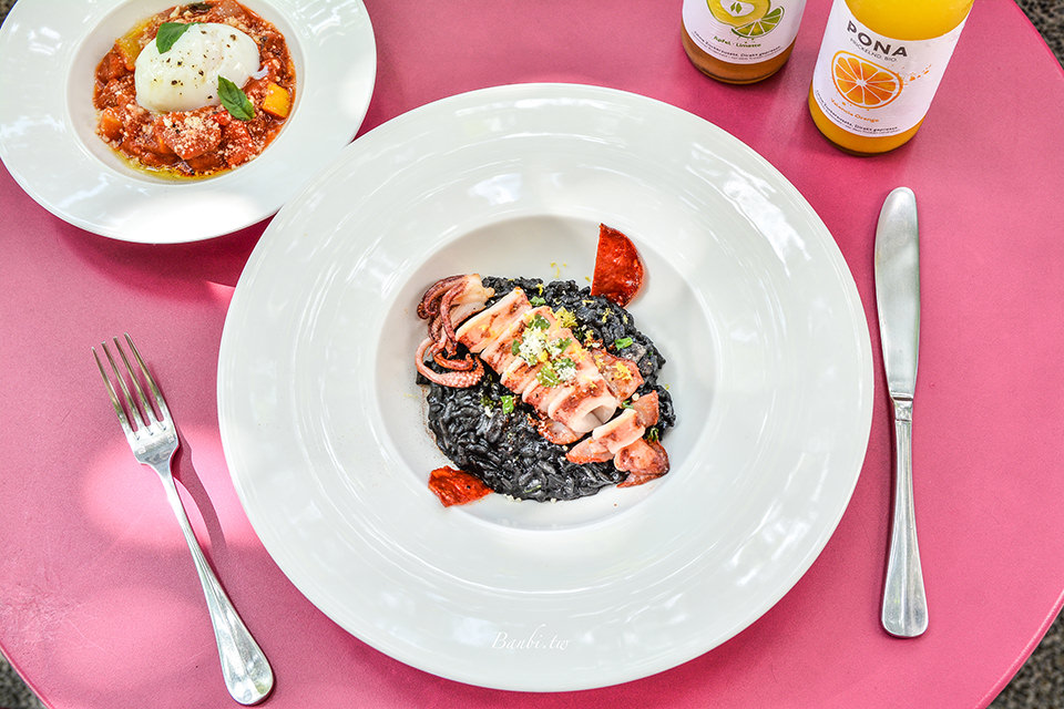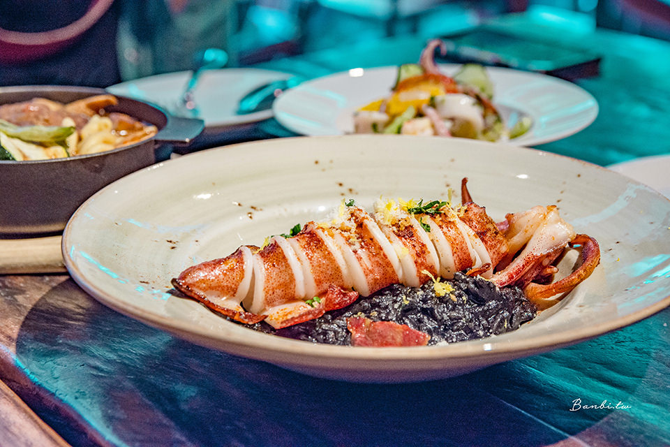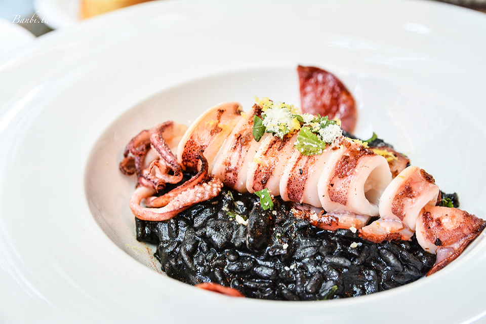我喜歡這道菜的口感,飯Q軟鹹香,上方的小卷新鮮,口感軟嫩,整道燉飯的香氣好,推薦也喜歡保有點米心口感燉飯的人點。因為墨魚汁的關係使得雙唇會被染黑,我想比較不適合曖昧期的對象來吃(笑)。