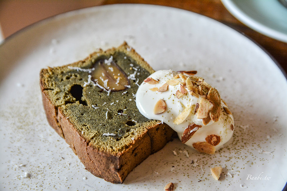 烤熱的抹茶磅蛋糕,外圍被烤至有點微酥的狀態,蛋糕則是軟綿帶點黏感與濕潤度。