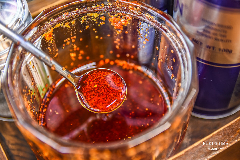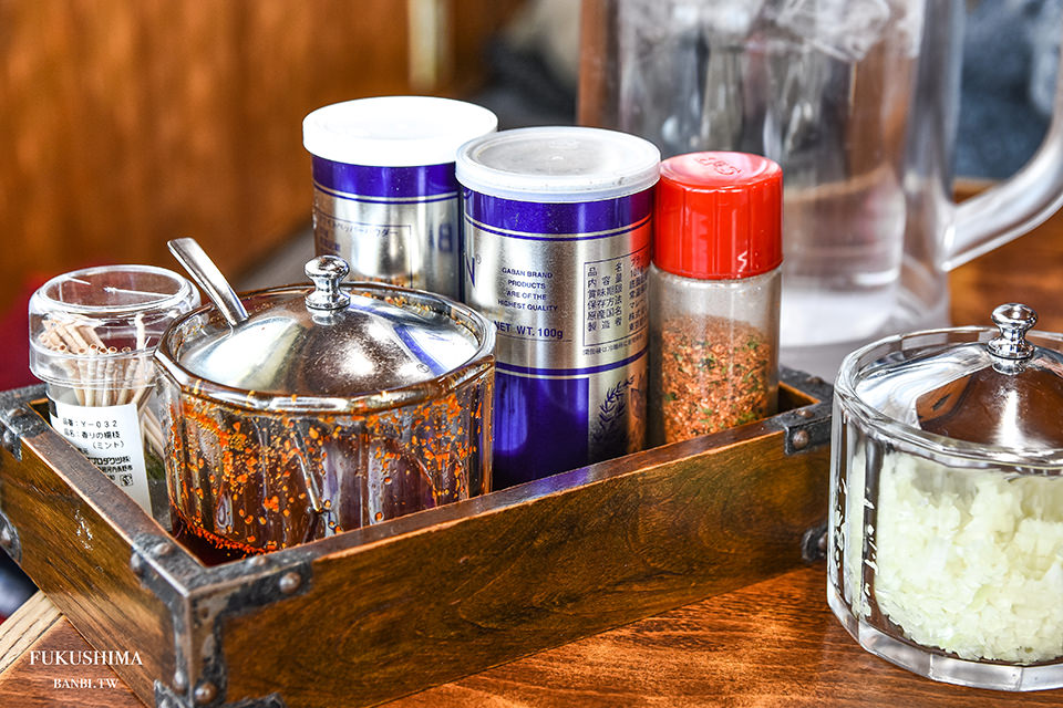 桌上有不少調味料可隨口味喜好酌量加入拉麵內搭配著吃(不過我會建議先喝湯頭原本的味道),有辣油、胡椒、七味粉、洋蔥丁。