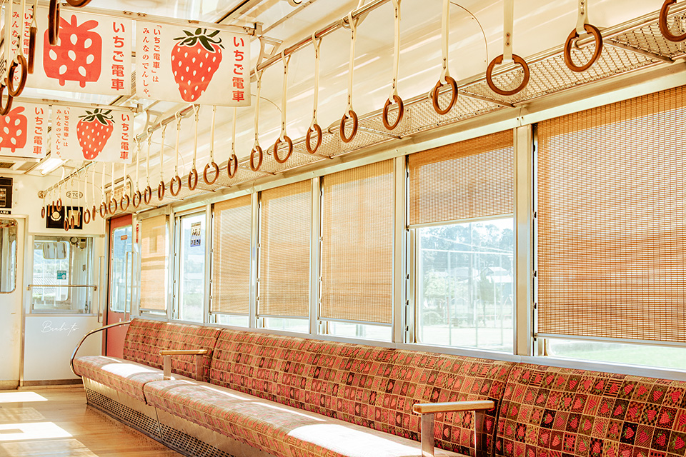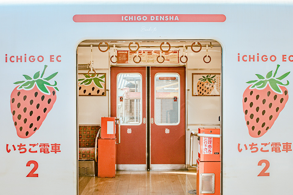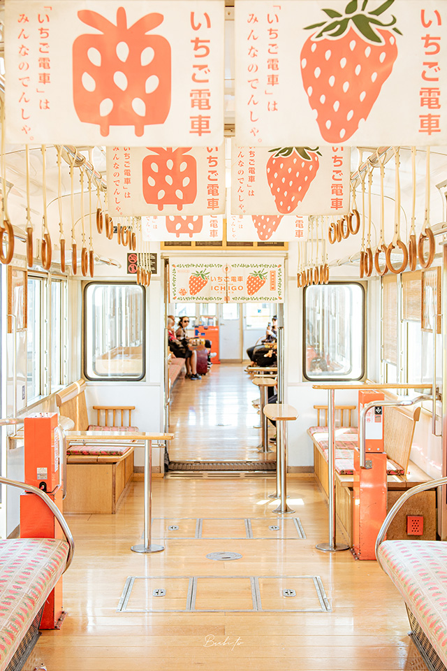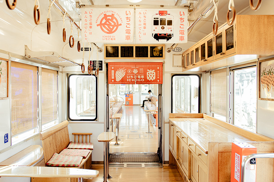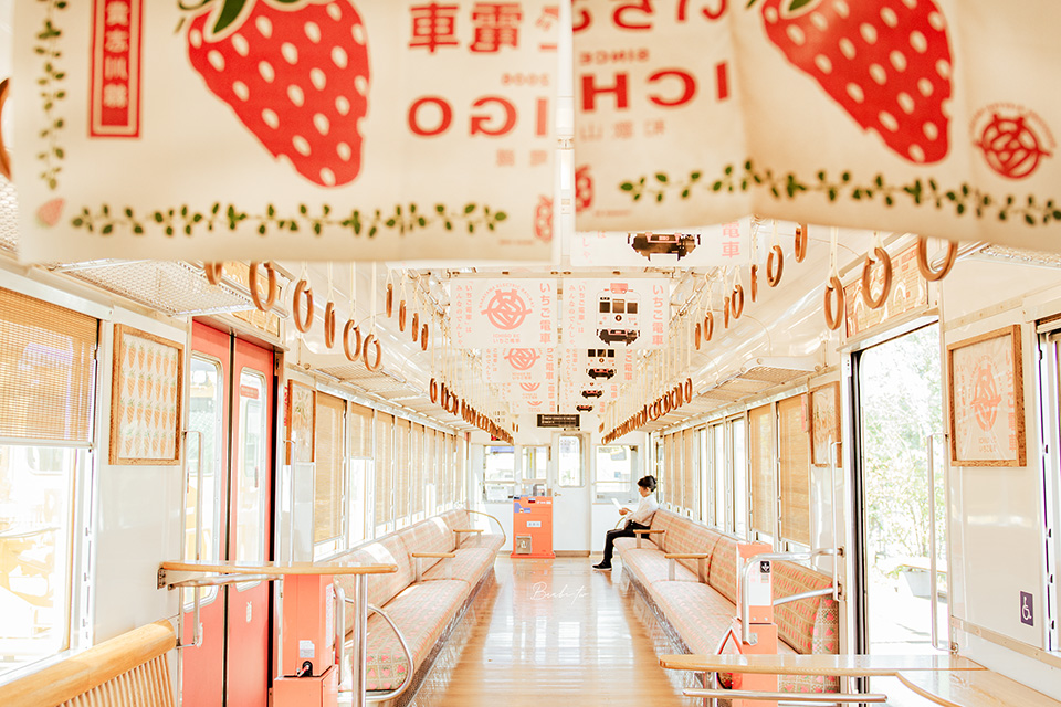 回程時我們搭到另一台超可愛的草莓電車,因貴志車站周邊盛產草莓,同時也有很多開放採草莓的草莓果園,所以水戶岡銳治老師便用草莓作為電車主題設計。