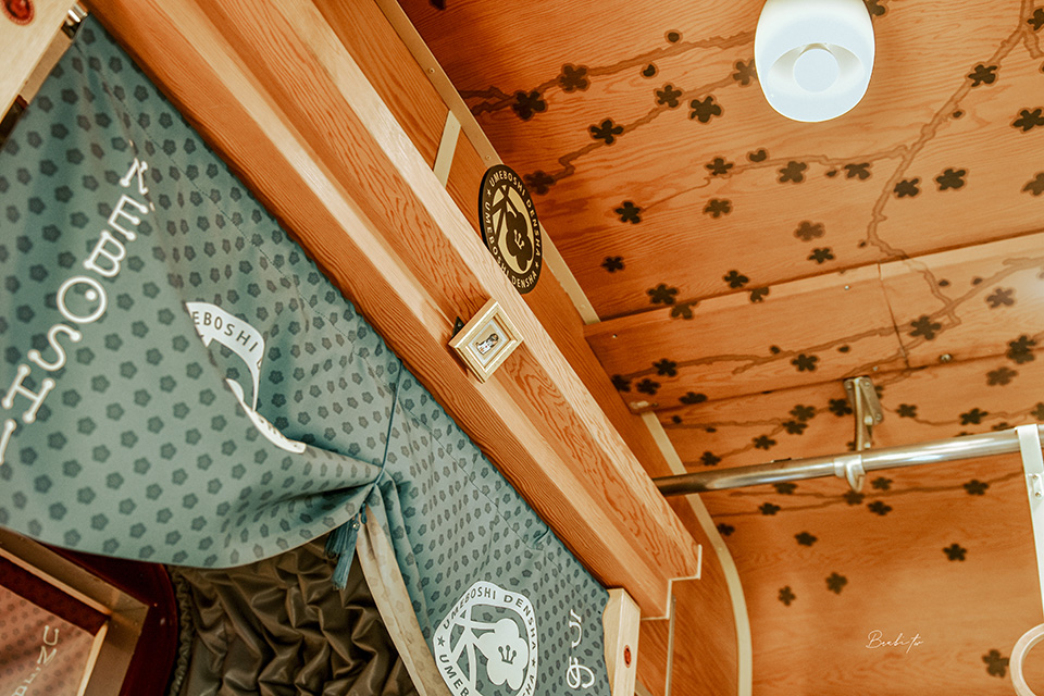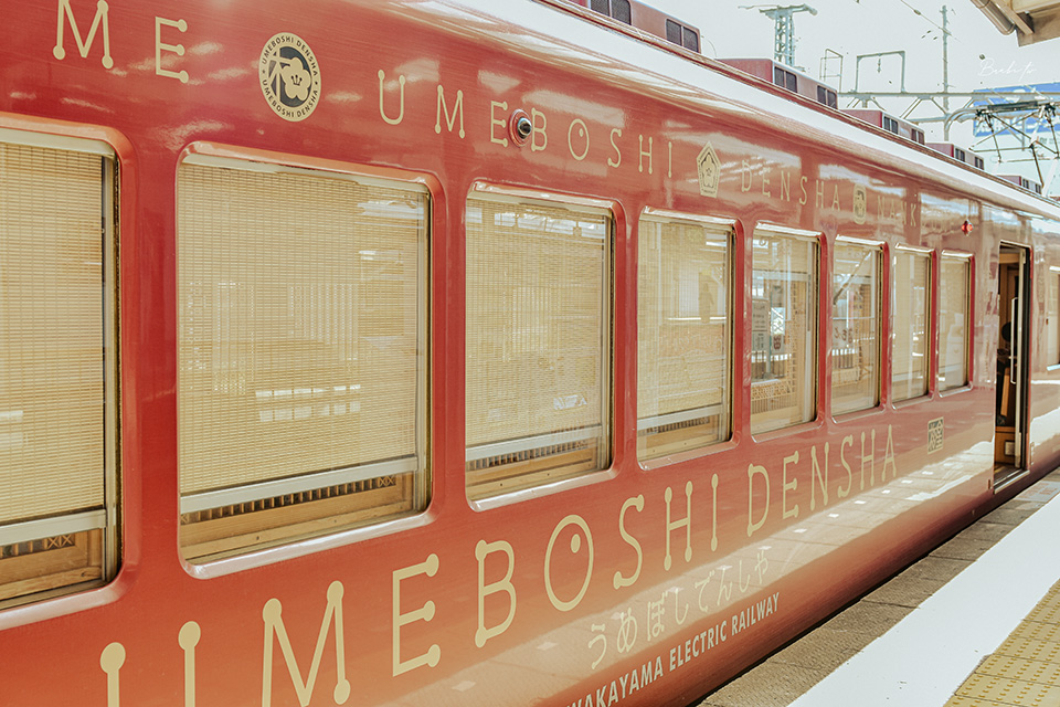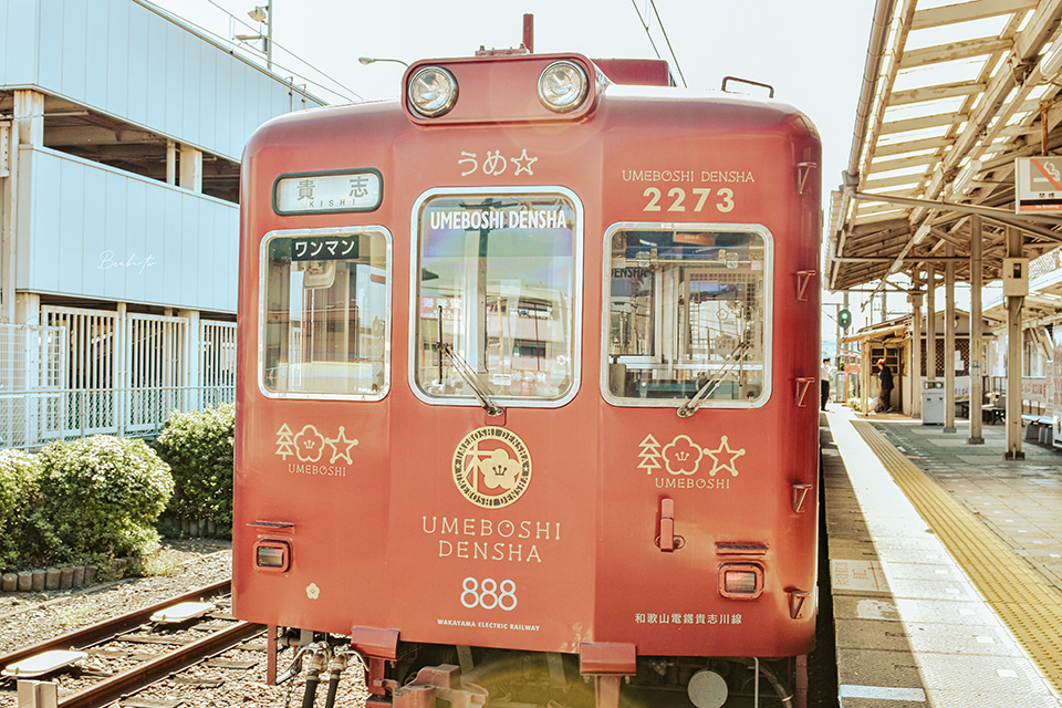 往貴志站的路上因車班時間關係,我們搭乘到水戶岡銳治設計師設計的梅星電車(うめ星電車 UMEBOSHI),以和歌山頗具驕傲的南高梅為發想,將梅、梅花、木頭、和歌山特產等成為列車元素,是台向日本各縣以及世界宣傳和歌山特產的列車。