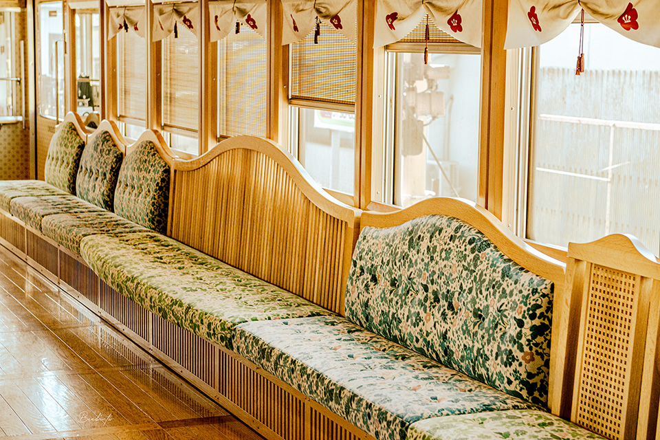 大量木造的地板、座椅還有窗框,連拉下的窗簾也都用竹簾設計,整台梅星電車非常有日式典雅感。