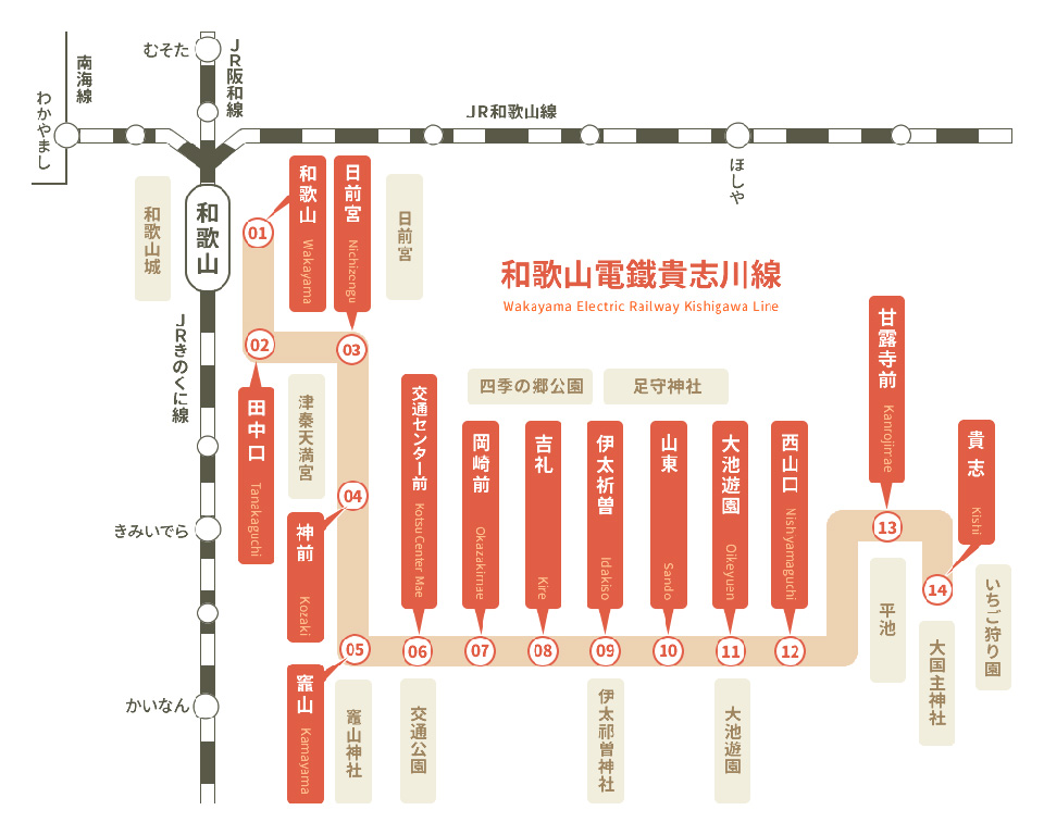 和歌山電鐵貴志川線路線圖和周邊景點,停靠車站共有14站,有可愛貓站長的車站為最後一站的「貴志」。