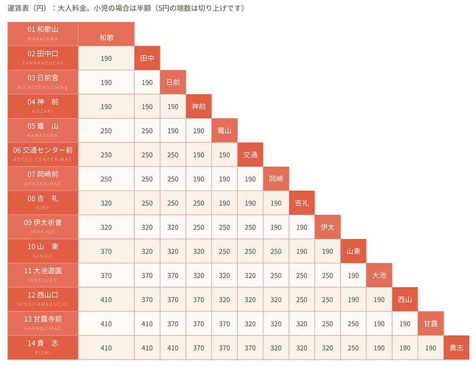 和歌山電鐵貴志川線的搭乘費用如上表,比方若住宿在JR和歌山車站附近,到一旁的和歌山電鐵「和歌山站」搭電車到貴志站單程為410日幣,特殊電車草莓電車、小玉電車、梅星電車、恰恰特快車、動物愛護電車以及新的小玉電車博物館號同樣適用。