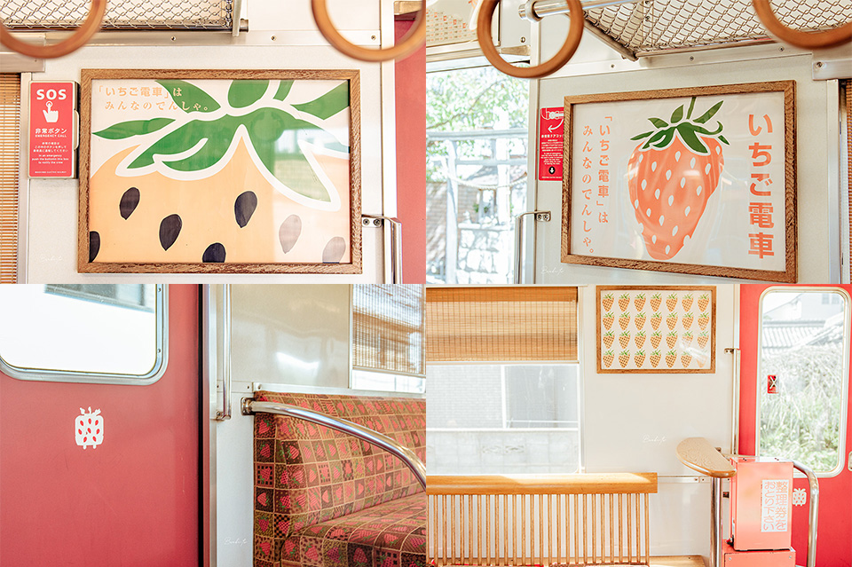 雖草莓電車沒有梅星電車那樣來的豪華,但車內的布旗、座椅、門上的圖案還有插畫,全部都是草莓!!超級可愛啊!