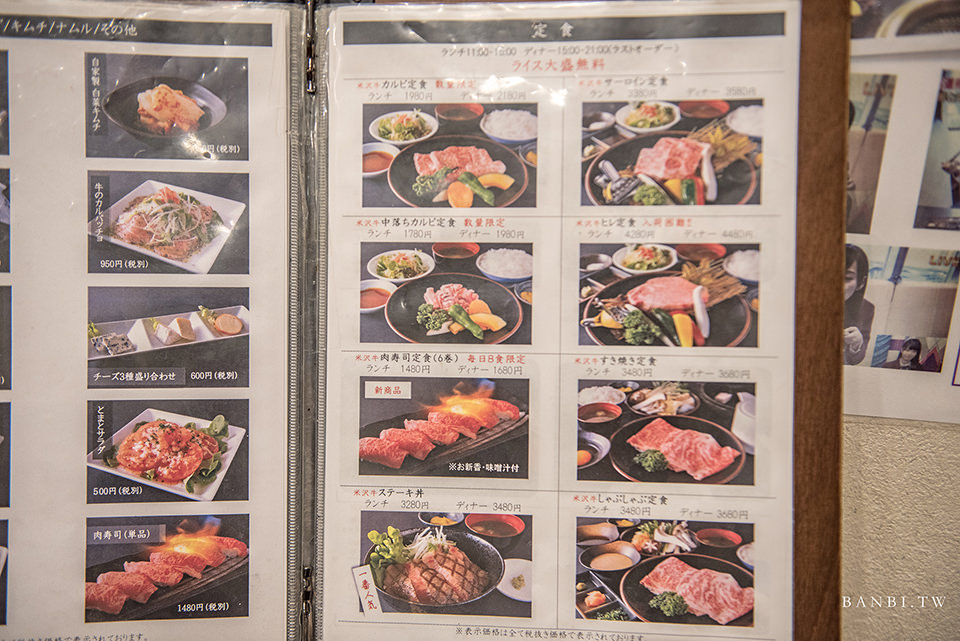 若是一人前來或是想一次吃到少量但是菜色較多的選項,建議可點選菜單上的「定食」,有不同的米澤牛部位燒肉、壽喜燒、牛肉壽司,價格依照午餐(ランチ)、晚餐(ディナー)不同,差價200日幣。