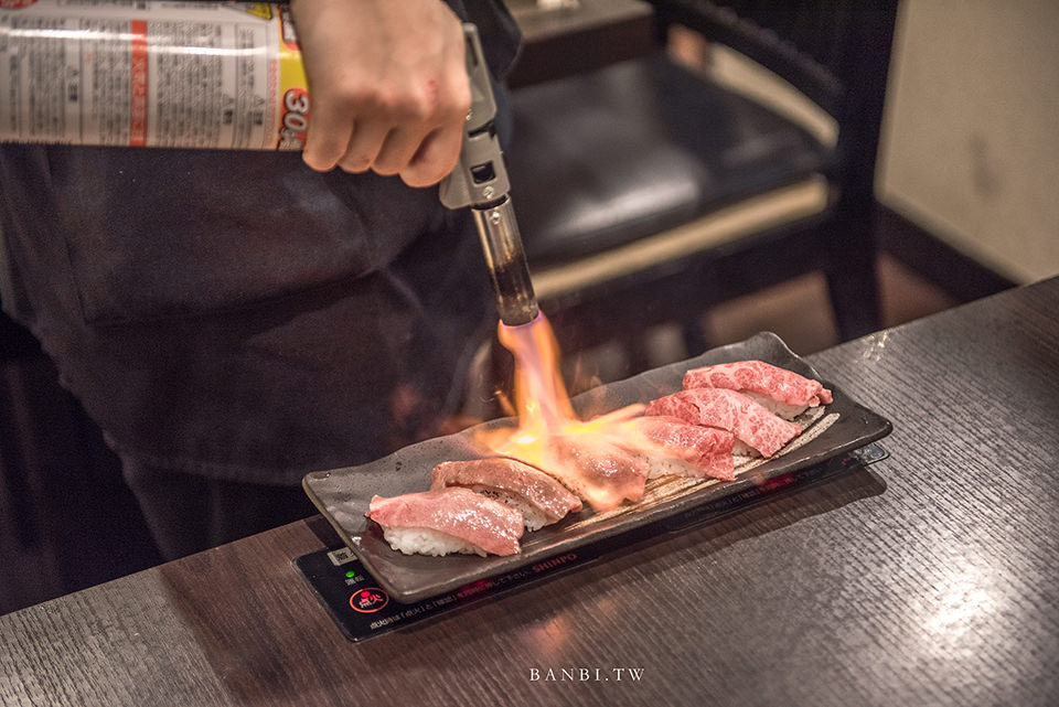 點了此道餐點後,米澤牛案山子的店內人員會將6貫的米澤牛A5肉壽司端至桌邊,現場直結於客人面前噴火槍炙燒,令我想起岐阜飛驒高山著名的牛肉壽司。